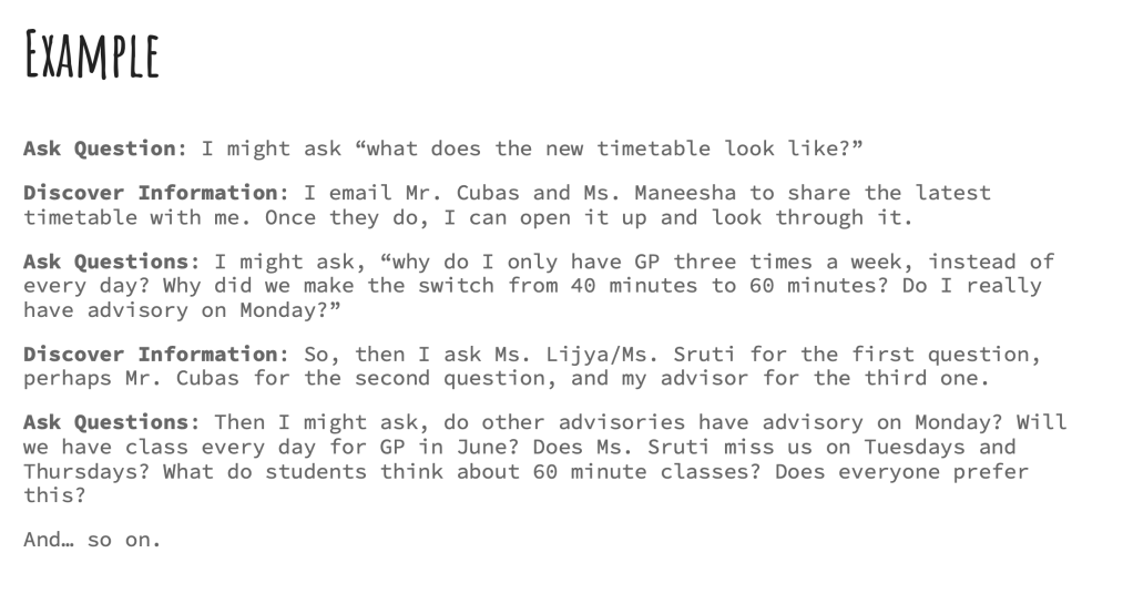Then, I have us read something. Some favorite assignments include the introduction of Carla Shalaby’s Troublemakers, Joseph Henrich’s WEIRD article, and Lucy Tse’s article on heritage languages. The goal with these lessons is for students to notice how the quality of their questions shifts after they have really read and explored something. I ask them to once again follow the question formulation technique after we have read one or more texts  — I want students to really see their own thinking change in terms of depth, specificity, and knowledge.